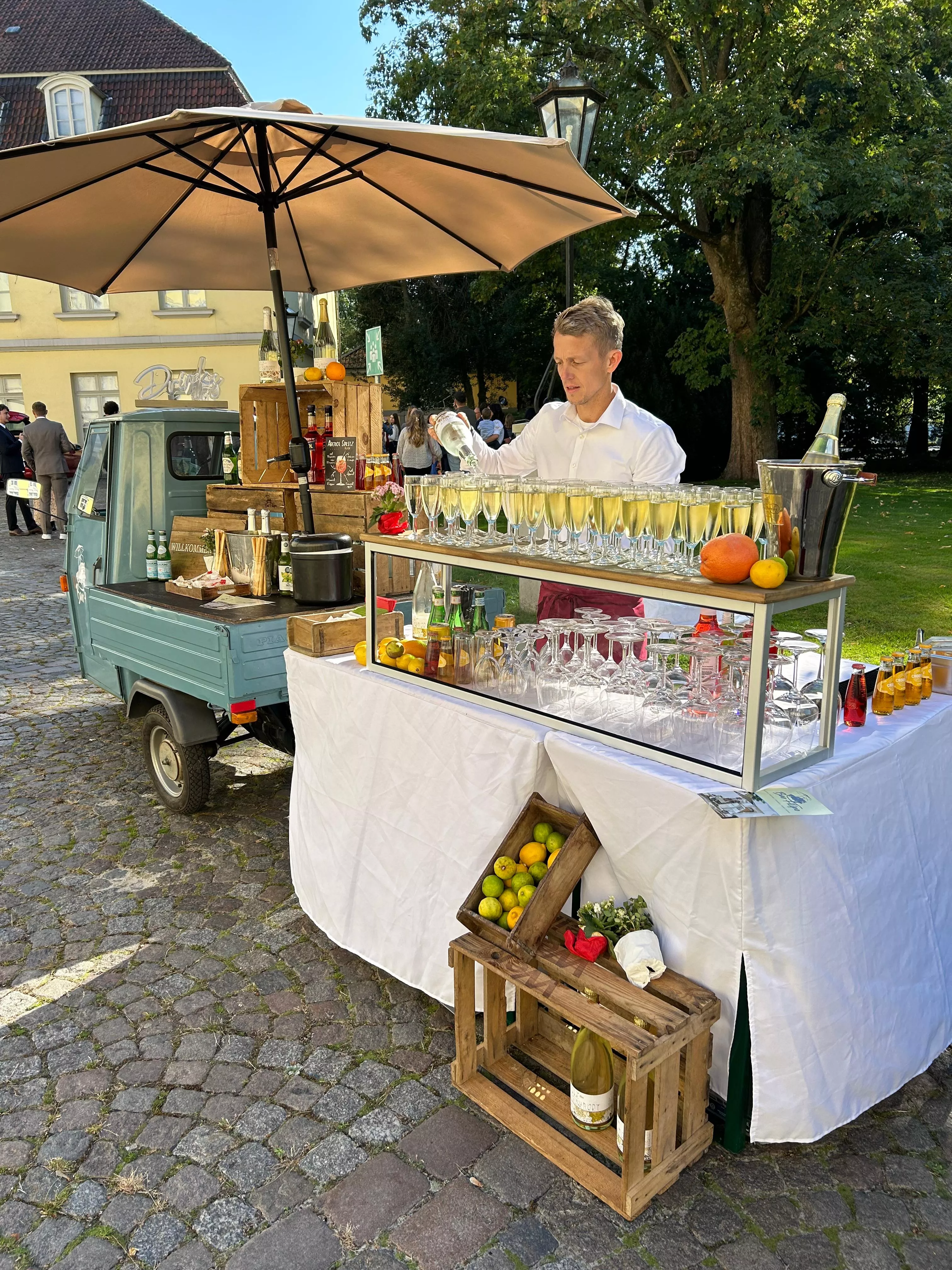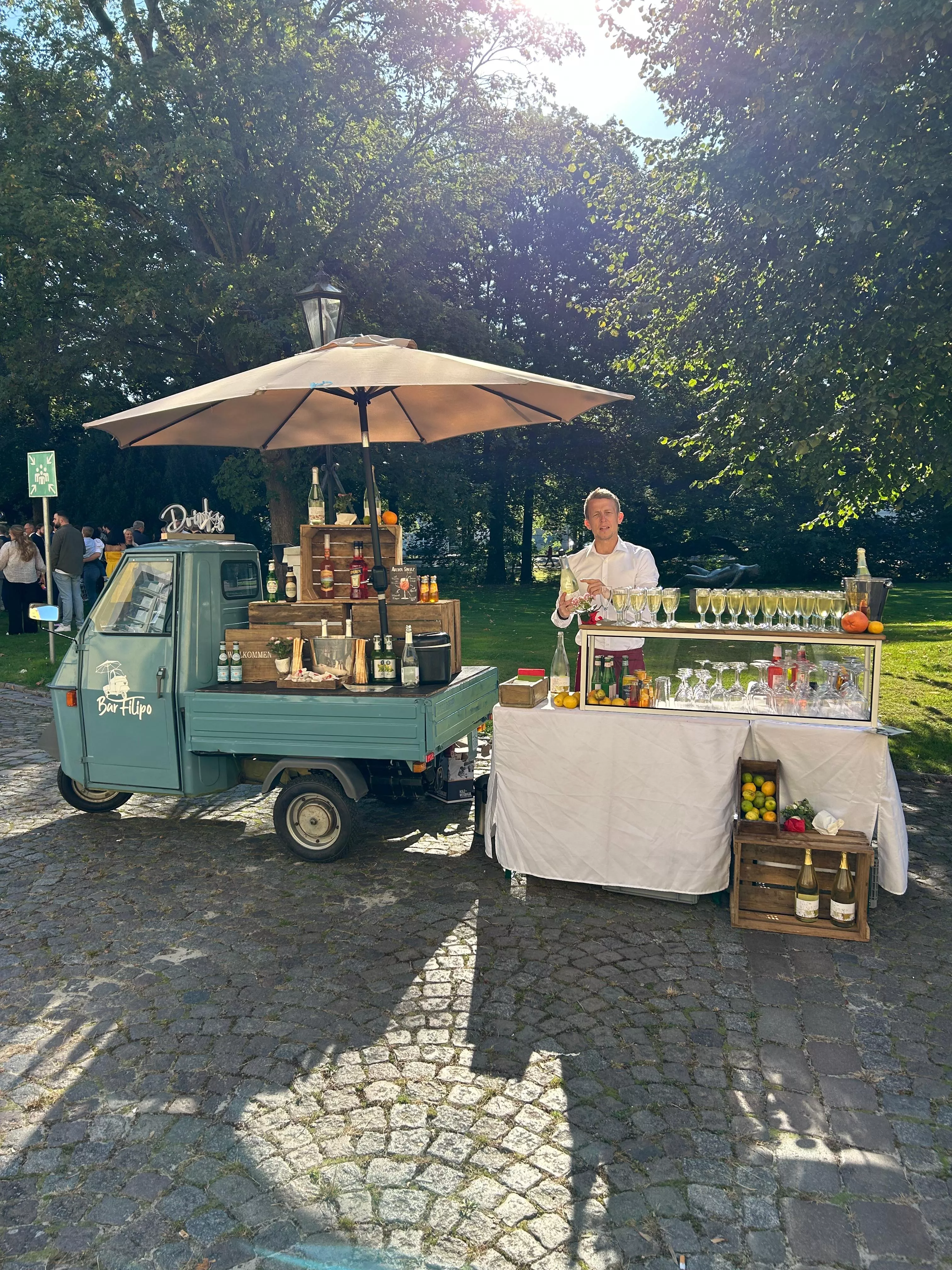 Mit unseren mobilen Bars, darunter original italienische Ape Fahrzeuge, begleiten wir Hochzeiten vom Sektempfang bis in den späten Abend. Ob feine Kaffeespezialitäten, moderne Spritzgetränke oder alkoholfreie Alternativen, wir verbinden Qualität, Atmosphäre und persönlichen Service zu einem Erlebnis, das individuell auf jedes Brautpaar abgestimmt ist.